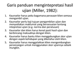 Untuk tujuan itu kaunselor kerjaya perlu menguasai sekurang-kurangnya satu ujian minat kerjaya satu ujian personaliti dan satu ujian nilai pekerjaan sebelum mereka boleh dianggap mempunyai kompetensi minimum dari segi penguasaan ujian psikologi dalam melaksanakan perkhidmatan bimbingan dan kaunseling kerjaya Sidek Mohd Noah 2016. Pembelajaran secara teori kajian lapangan juga pra amali dapat diaplikasikan dalam setting sebenar di industri kaunseling. Bagi guru keputusan ujian pencapaian dapat membantu mereka mencari jalan meningkatkan mutu pengajaran.