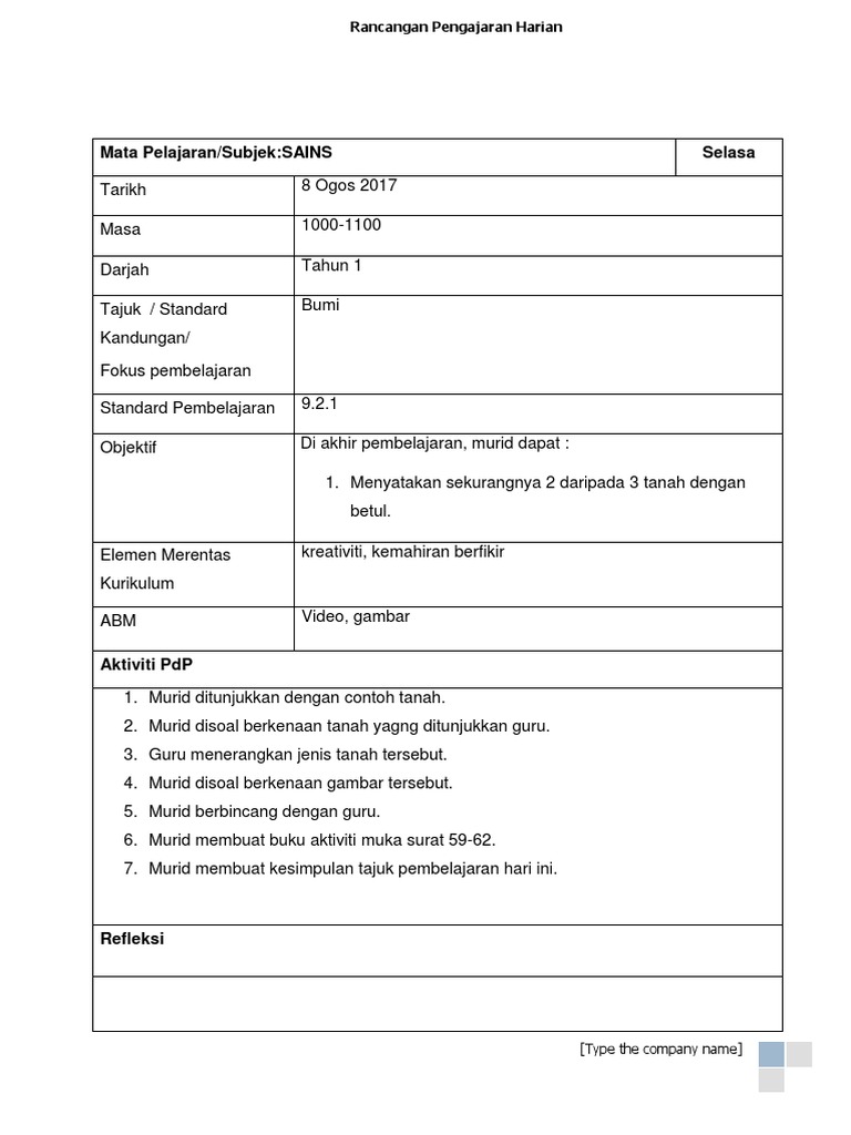 RPT Sains Tahun 1 2018. Contoh penulisan refleksi dalam buku persediaan mengajar dicatat selepas setiap waktu pp di ruang bawah rph 1. RPT Pengakap Sekolah Rendah.